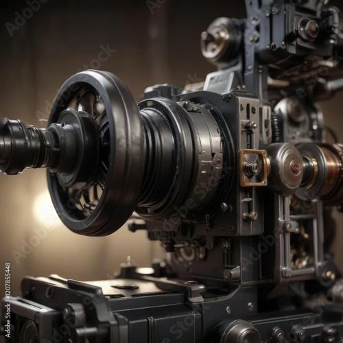 Close-up of film projector mechanism in moody lighting, technology, vintage, cinematic