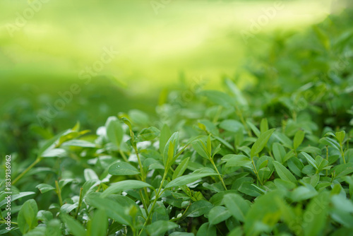 Close-up of fresh, bright green hedge foliage and new shoots against a soft, sunlit, high-key bokeh background.