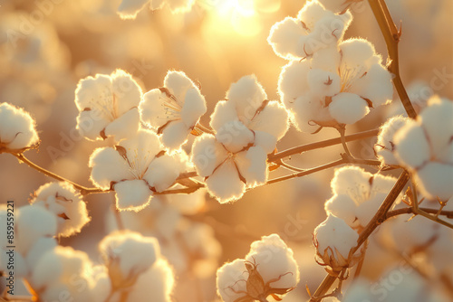 Close-up of fresh, fluffy cotton bolls with delicate jasmine flowers peeking through, set against a soft amber light background,
