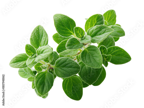 Close-up of fresh oregano sprigs. Lush green leaves cluster on stems, detailed texture visible. Bright, isolated against black background