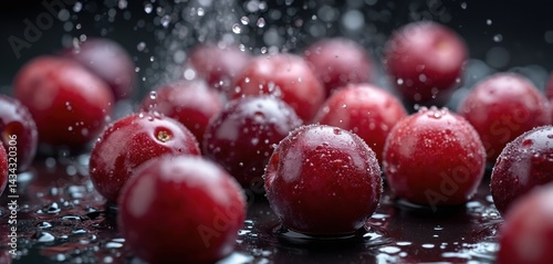 Close-up of fresh plums with water drops. Juicy red fruits, healthy food rich in vitamins. Beautiful splash on dark background. Concept diet, nutrition, organic farming, harvest season.