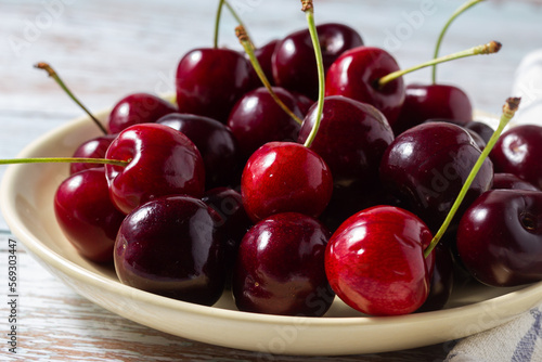 Close-up of fresh sweet cherries on a yellow plate on a wooden background.