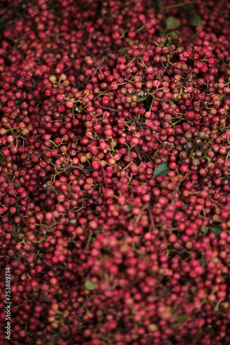 Closeup of freshly picked red peppercorns