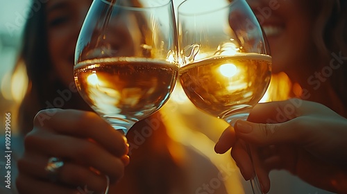 Close-up of friends' hands clinking wine glasses, reflections of smiling faces and laughter, vibrant atmosphere, soft sunlight illuminating the scene, festive and cheerful vibe, hd quality,
