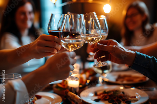 Close-up of friends toasting with white wine glasses at a festive gathering, with a warm, blurred background. Generative AI