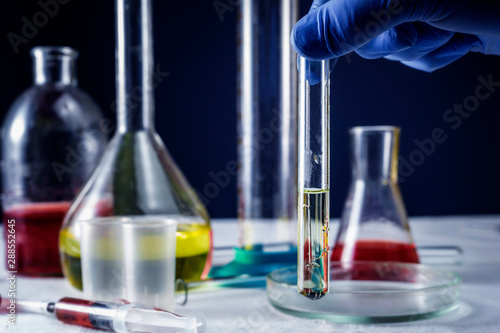 Close-up of glass tube with blue fluid in scientist hand during medical test