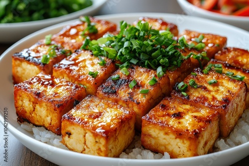 Close-up of Glazed Tofu Cubes with Green Onions Served Over Rice