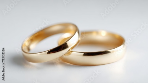 Close-up of golden wedding bands on white background, representing unity, love, and lifelong commitment