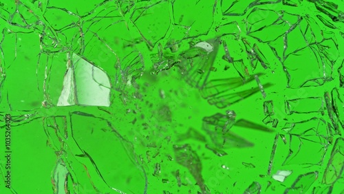 Close-up of gunshot through the glass, shattering against the green background
