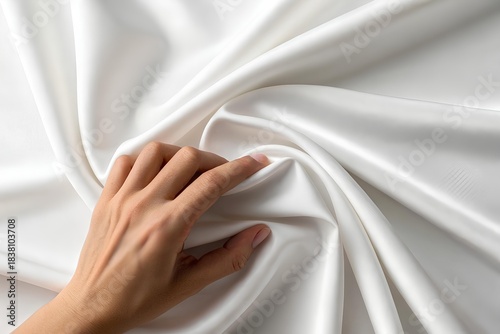 Close-up of hand gently gathering smooth white satin fabric, highlighting its soft texture and elegant folds