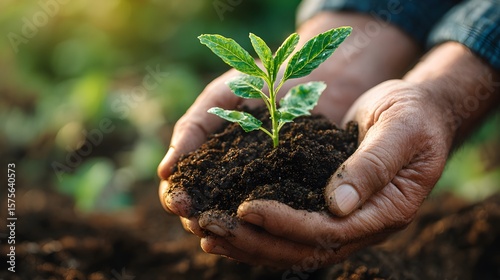 Close-up of hands holding rich soil with a young green plant sprouting, symbolizing growth and sustainability.