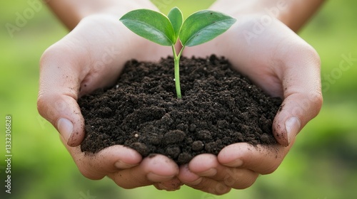 Close-up of hands holding soil with a young plant, a banner for an environment and nature protection day concept. Green background with sun rays. Stock photo contest winner, high resolution, good ligh
