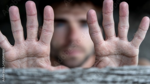 Close-up of hands outstretched. A person's hands are extended forward in front of a blurry face and textured surface