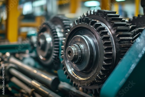 Close-up of industrial metal gears inside a mechanical machine in a factory setting, highlighting engineering precision and industrial strength
