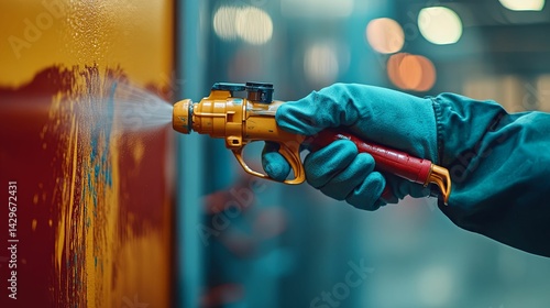 Close-up of industrial paint spraying process on metal surface.