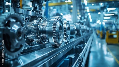 Close-up of intricate gears and machinery on a factory assembly line.