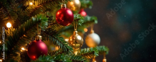 Close-up of intricately styled Christmas tree adorned with an abundance of shiny glass and metallic balls, metallic balls, christmas tree, seasonal
