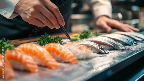 Close-Up of Japanese Businessman Signing a Document in a Professional Setting with a Gourmet Sushi Background