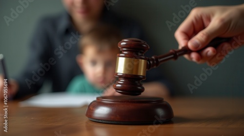 Close-Up of Legal Judge’s Hammer with Blurred Child in Background Child Custody Concept