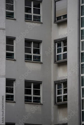 Close-up of light gray building facade with several double-pane windows featuring white frames. The texture of the wall contrasts with smooth glass surfaces, and nearby green foliage adds natural soft