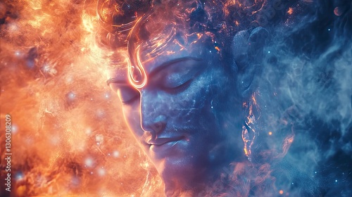 Close-up of Lord Shiva's face in meditation, his divine aura radiating through a tranquil cosmic background