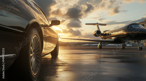 Close-up of luxury car with private jet at sunset on wet airport tarmac