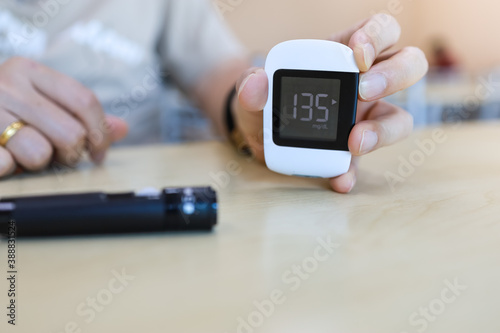 Closeup of man hand holding Glucose meter with lancet on wooden table using as diabetes, glycemia, health care and people concept.