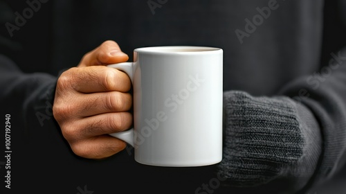 Close-Up of Man Holding White Mug of Hot Beverage Outdoors with Black Background and Copy Space for Text