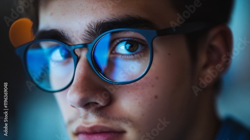 Close-up of man in blue glasses. Perfect for vision, focus, or technological perspective content.