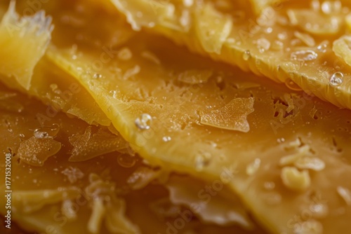 Close-up of melted cheese with droplets