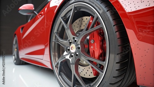 Close-up of Modern Sport Wheel with Red Brake Calipers - High-Performance Automotive Detail
