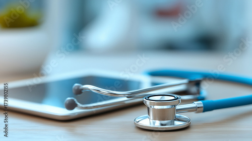 Close-up of nurse’s stethoscope on desk with tablet