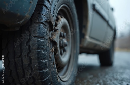 Close-up of old car tire with damage. Worn tire with hole on the road concept. Breakdown on highway. Rubber tire detail shows transportation problems.