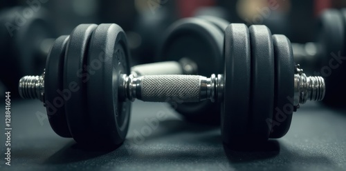 Close-up of pair of dumbbells; textured rubber grips, weight plates visible , bodybuilding, weights