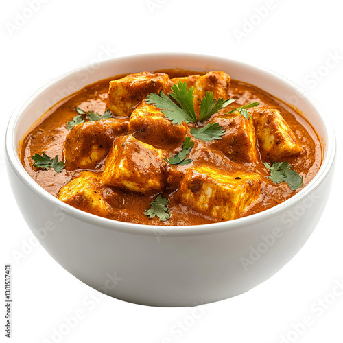 close-up of paneer tikka masala in a white bowl from a low perspective