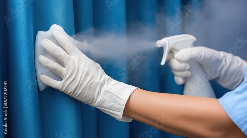 Close-up of person cleaning blue curtains with gloves and spray bottle