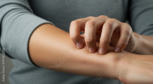 Close-up of person scratching arm showing skin irritation suitable for health blogs, medical websites, and dermatology concepts