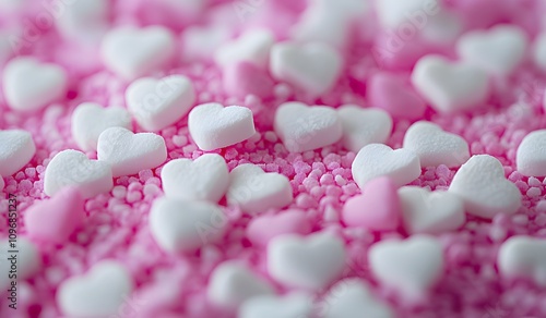 Close-up of pink and white heart-shaped sprinkles for a Valentine's Day cake decoration,
