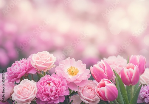 Close-up of pink roses, tulips, and peonies in full bloom with a soft bokeh background, symbolizing beauty, romance, and spring.