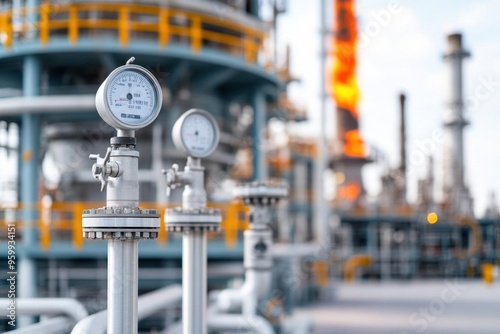 Close-up of pressure gauges in a modern refinery, highlighting the industrial efficiency and technology of oil processing.