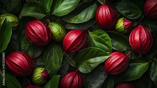 Closeup of Red Fruits and Green Leaves Nature's Vibrant Composition, Detailed Texture