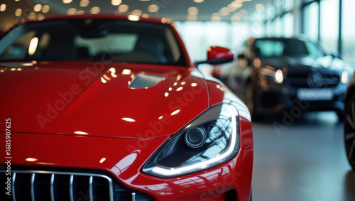 Close-up of red luxury car in modern showroom with blurred vehicles in background. Glossy surface and elegant design emphasize exclusivity