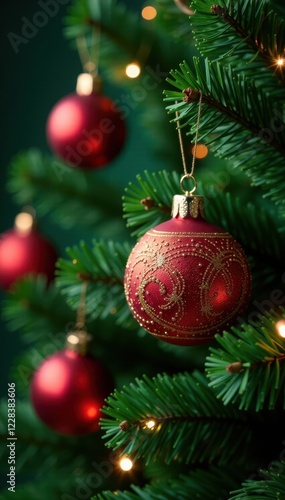 Close-up of richly decorated Christmas tree ornaments on a plush green background , festive background, Christmas tree