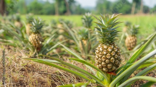 Close-up of ripe pineapple fruit with spiky green leaves growing in tropical field under sunlight on a summer day, surrounded by young pineapple plants and lush grass in vibrant natural daylight scene
