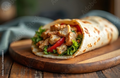 Close-up of savory chicken shawarma wrap served on wooden board. Warm meal features marinated meat fresh vegetables, soft tortilla. It is perfect for food blogs restaurant menus or culinary content.