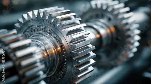 Close-up of shiny metal gears in motion, interconnected and intricate, representing teamwork and engineering.