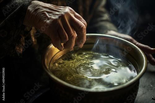 Closeup of sinister old woman brewing magical potion in bubbling cauldron at night.