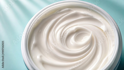 Closeup of smooth lotion texture in white jar on light blue surface, showing creamy and soft skincare product with gentle swirls, evoking fresh and soothing feeling