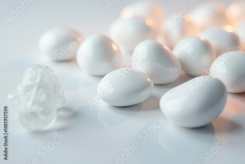 Close-up of smooth white marbles, scattered on a surface , sphere, surface, scattered