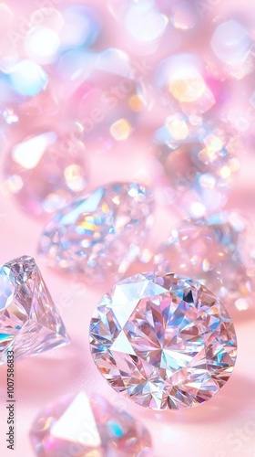 Close-up of sparkling diamonds with rainbow reflections on a soft pastel pink background, creating a luxurious and dazzling visual effect.